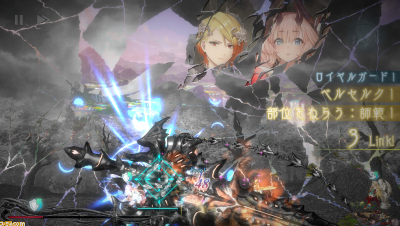 さらに戦闘が進むと、何らかの条件が満たされることで“Ωリング”という別のリングが出現。このリングが表示されている画面を連打すると“シンクロ率”が上昇し、巨神に大ダメージを与える誓女たちの協力攻撃が発動する。