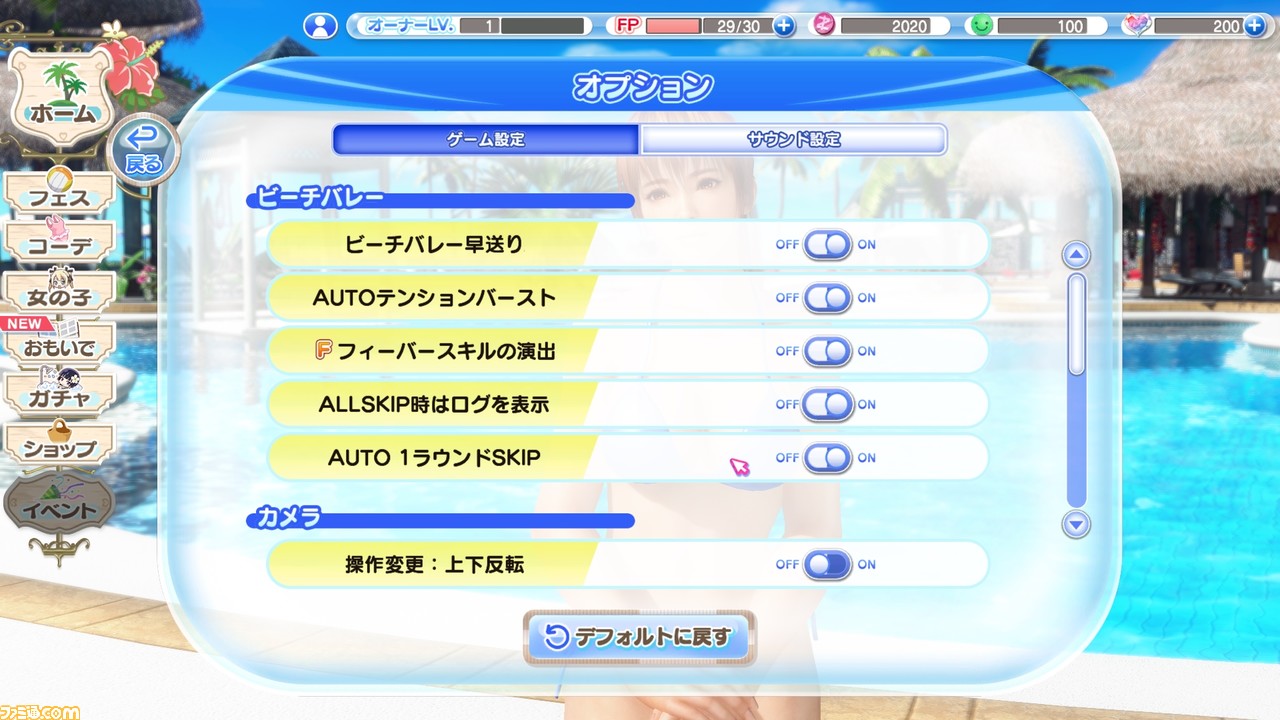 この時点でビーチバレーしている女の子を眺めるのもいいですが、しっかり環境を整えてから眺めたほうがうれしくないですか!? あとぶっちゃけこのゲームは今後も一生このビーチバレー画面を見ることになるので、ガンガンスキップしていいです!