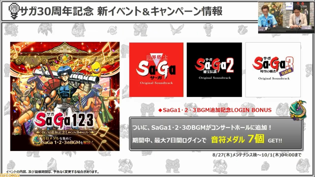 『Sa・Ga』1~3のBGMがコンサートホールに追加されたことを記念して、期間中、最大7日間ログインで“音符メダル”7個がプレゼントされる。