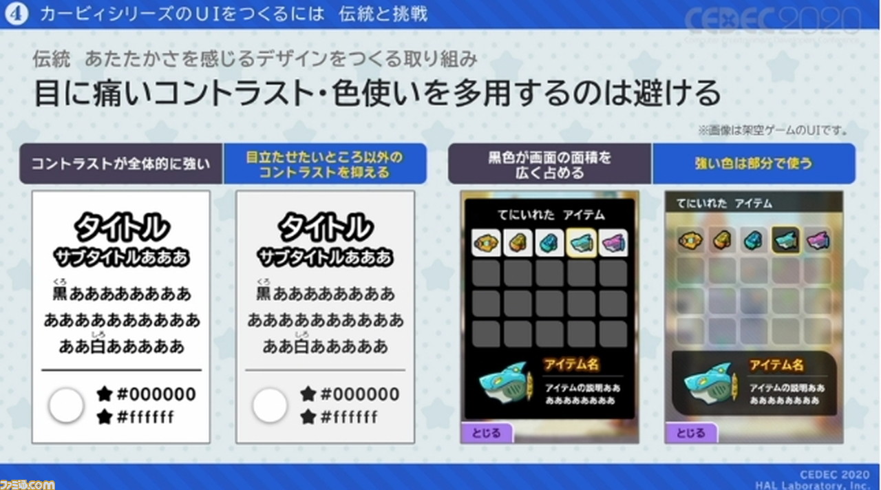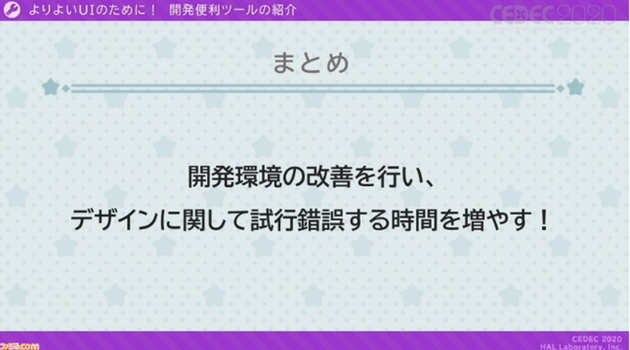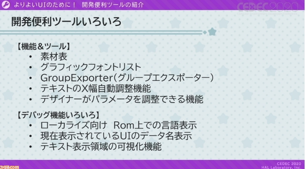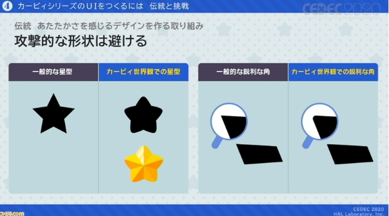 2020年9月2日~4日、初のオンライン開催という形で行われたCEDEC 2020。本稿では、会期二日目にあたる9月3日に行われた、株式会社ハル研究所の伊藤晴香氏、剣持紫氏による“カービィUIでおもてなし!「ゲームとプレイヤーを繋ぐUI」を目指して”の内容をリポートする。
