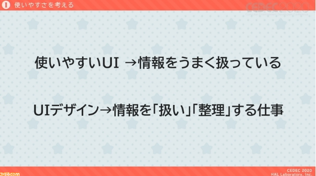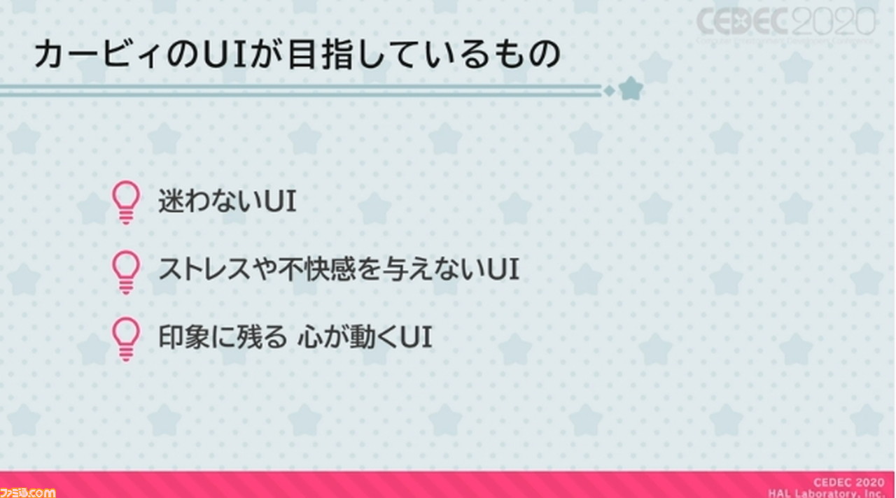 本セッションでは、『星のカービィ』シリーズを手掛ける際、UI(ユーザーインターフェース)チームが大切にしている3つの要素が語られた。ストレスを感じさせない、使いやすいUIとはどのようなものなのか。何気なく見ていたUIに施された工夫は、同シリーズをプレイしたことがある人ほど納得できる興味深い内容になっていた。
