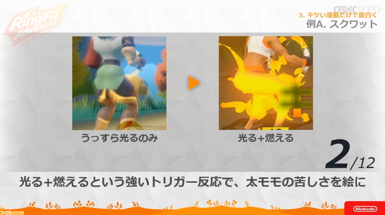運動をスクワットを行った際に頭や脚が燃え上がるといった見た目の演出変化や、体制をキープしている際の効果音の調整、身体の負荷に共感するようなコントローラーの振動、攻撃の際のビームなどは、そのなかでもわかりやすいものだろう。