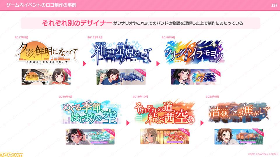 まずは、デザインの継承と定着について、ゲーム内ロゴ制作の事例とともに紹介された。『ガルパ』では、月に3回イベントが開催されているが、その際に制作されたイベントロゴは、累計120個以上にも及ぶという。数多くのロゴが制作されているが、その中で、ユーザーにバンドやメンバーについて愛着を持ってもらうため、さまざまな工夫がおこなわれているそうだ。