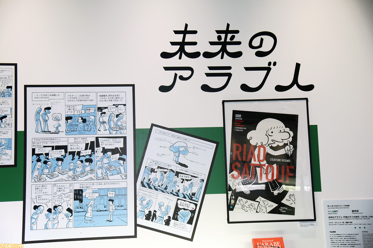 漫画部門の区画では、各受賞作のブースごとに原画が多数展示されているため、ファンにはたまらない構成になっている。シンプルなタッチでロボットと人間が共存する世界を描いた大賞受賞作『ロボ・サピエンス前史』をはじめ、20世紀初頭のフランス・パリを舞台に娼婦たちの生きざまを描く『鼻下長紳士回顧録』、テレビドラマ化もされ好評を博した『闇金ウシジマくん』など、いずれも話題性のある作品ばかりなので、きっとコミックスを読みたくなるはず。