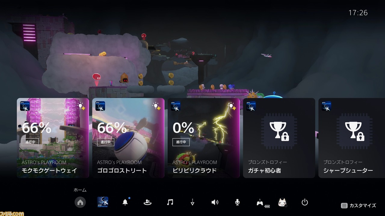 ログインすると、PS5のメニュー画面へ遷移する。この画面で表示されるのは、PSシリーズではおなじみとなっている、橫一列に並んだアイコン群だ。デフォルトの状態だと、もっとも左にあるのはご存知”PlayStation Store”にアクセスできるアイコン。その右には、最近アクセスした順にアプリが並ぶ。なお、初期状態でも、プリインストールされている『ASTRO’s PLAYROOM』や『Share Factory Studio』が確認できるはずだ。
