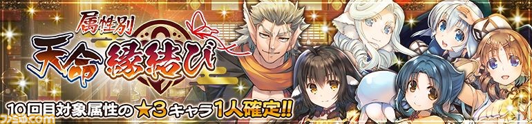 ガチャ「【10回目対象属性の★3キャラ1人確定!!】属性別天命 縁結び」を開催中!