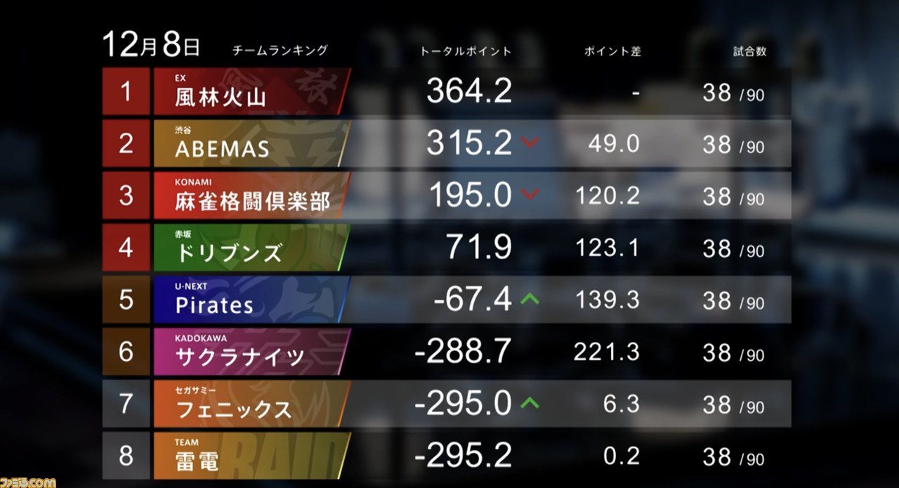 長らく1位の位置にいたEX風林火山が12月に入り滝沢和典・二階堂亜樹の両選手が立て続けに1着を取り再び躍進。2位以下のチームを大きく引き離した。