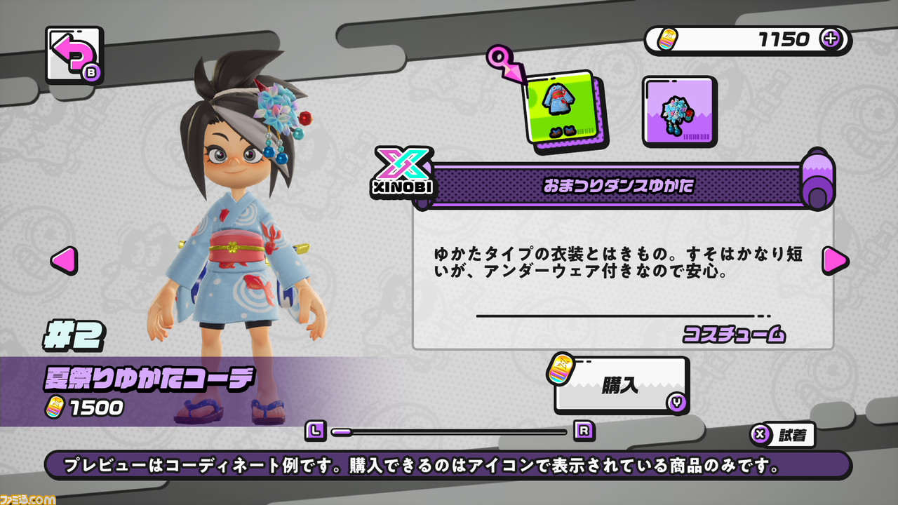 同じく“和”をイメージしたステージ“シノビシティ”でのバトルに着ていくにはピッタリかも。ガムウェポンはトリックボールやかっとびサーフがスポーティで似合いそう。ステージやガムウェポンによってコスチュームを変更するのも本作の楽しみかたのひとつだ。