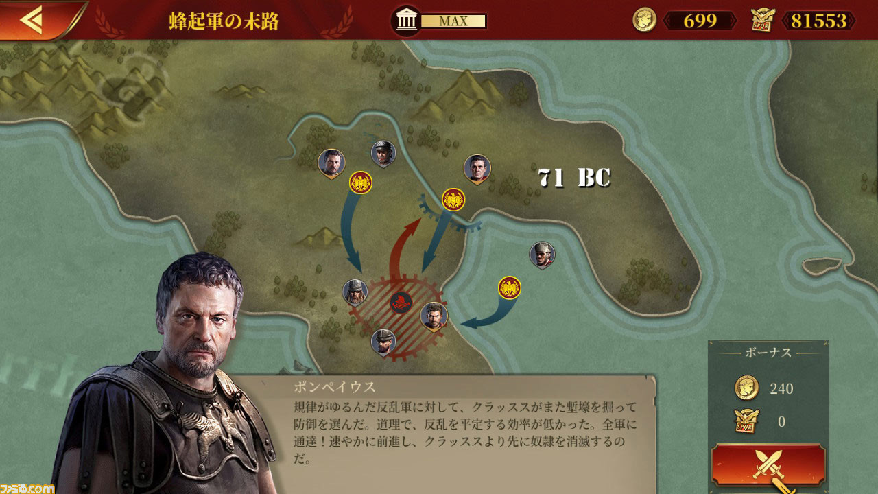 ゲームの舞台となるのは、ローマ共和国が台頭し始め、周辺の強大な国々が互いに覇権を争っていた一触即発の時代です。プレイヤーはカエサル、ポンペイウス、アントニウス、オクタウィウス、スパルタクスといった偉大な将軍たちと手を組んで戦いながら、共に大征服者誕生の瞬間に立ち会います。