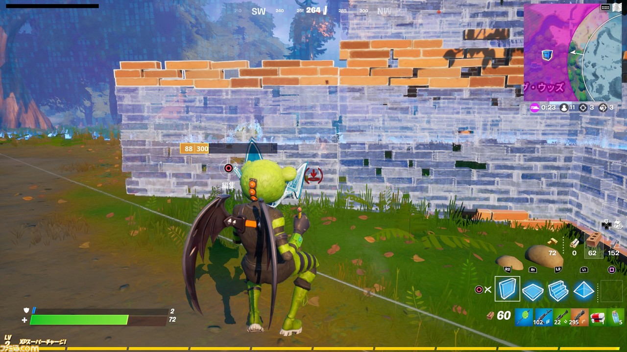 本作の肝となるのが“建築”だ。マップにある家や車などのオブジェクトを最初から持っているツルハシで叩くことで素材を入手でき、それを消費して壁や足場を作り出せる。