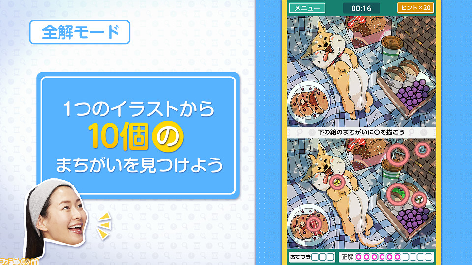 本作は、すばやくまちがいをさがす「爽解モード」、みんなでまちがいをさがす「宴解モード」、そして、じっくりまちがいをさがす「全解モード」の3つのモードを収録し、ひとりでも、みんなでも、まちがいさがしで楽しく右脳を刺激することができる「まちがいさがしアクションゲーム」です。まちがいさがしの種類は20種以上、さらに500枚以上のイラストを収録!1プレイ当たり10分程度なので、時間のない方でも手軽にゲームをお楽しみ頂けます。