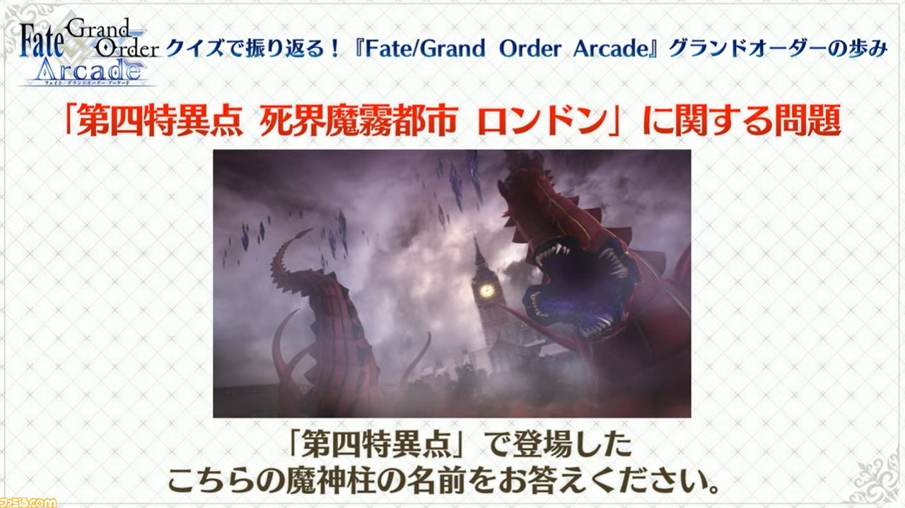 番組では、シングルプレイ“グランドオーダー”のこれまでを振り返るクイズも実施された。このクイズ時代が、『FGOアーケード』をプレイしたことがない人に向けた、アプリとの違いを紹介する内容となっているようだ。