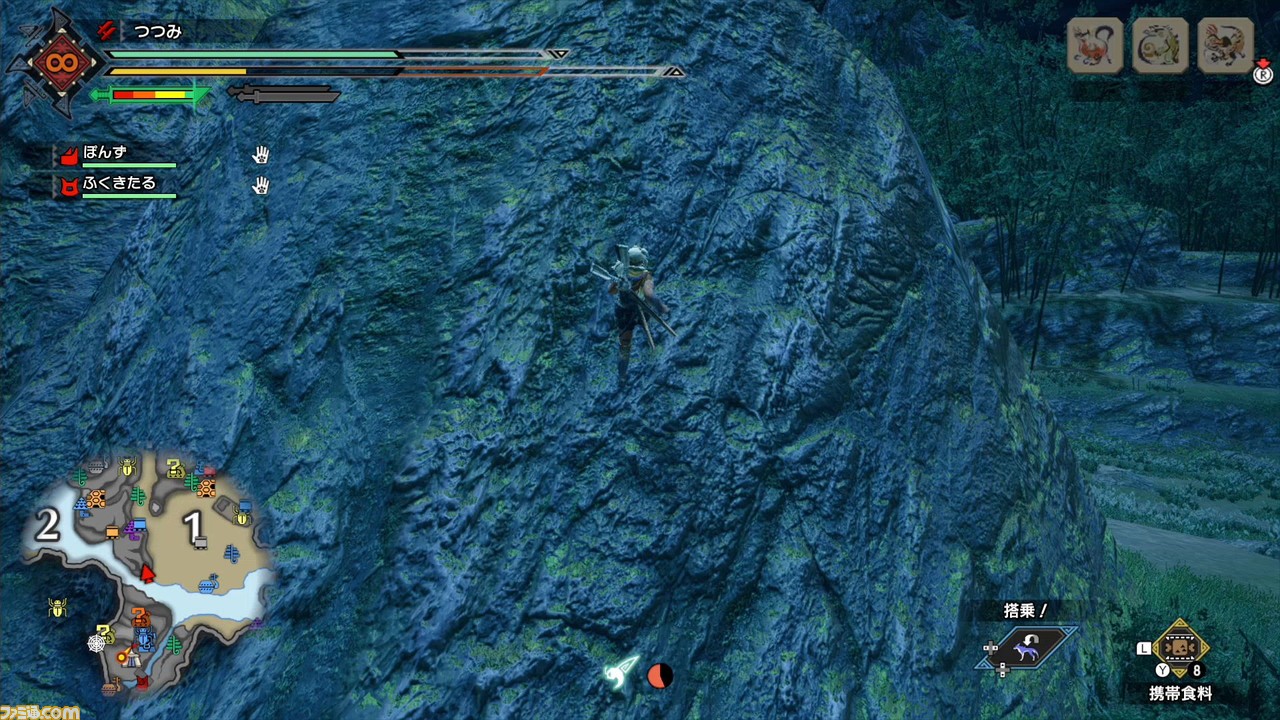 本作のフィールドは起伏に富んでおり、疾翔けだけでは上りきれない段差も多く存在する。そこで役に立つのが壁走り。壁にぶつかるように疾翔けを実行すると、ハンターが壁走りを始める。左スティック+Rボタンでスタミナが持続する限り、壁を縦横無尽に移動可能だ