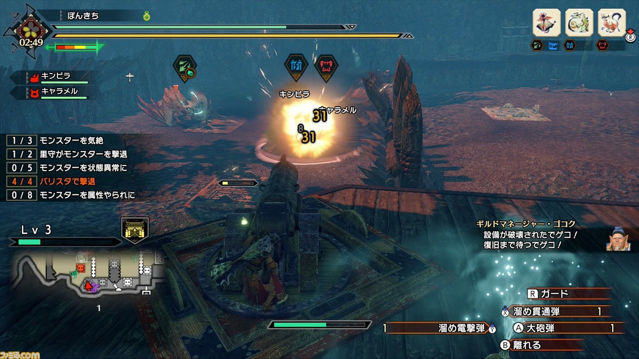 - 大砲:放物線を描いて落下する砲弾を撃つ狩猟設備。砲弾は着弾時に爆発し、周囲を巻き込んで攻撃できる。攻撃力が高く、複数のモンスターを狙うのに適しているが、耐久値が低め。