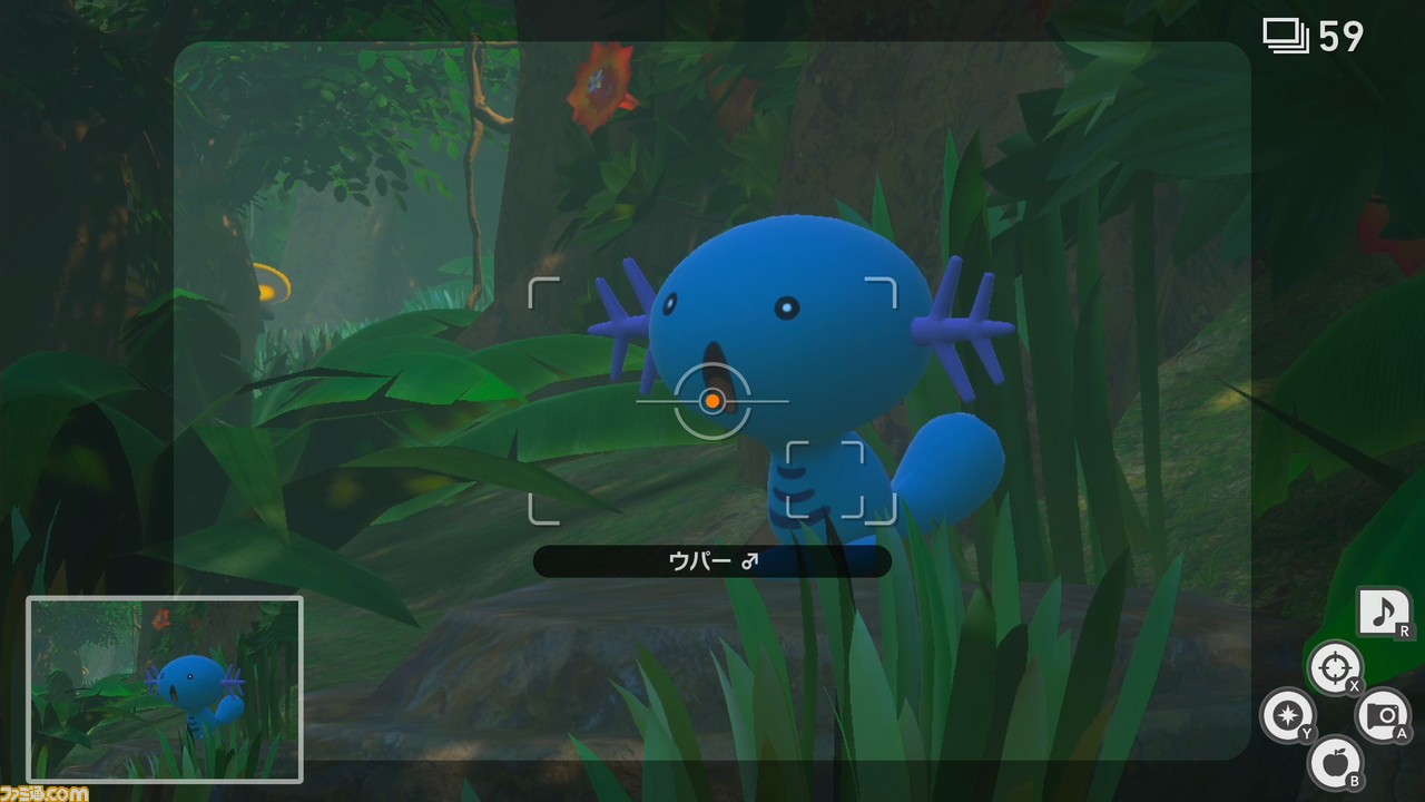 本作では撮影した写真を博士に評価してもらえるのだが、その基準はポーズ、大きさ、向き、位置、ほかのポケモンの5つ。評価の高い写真を撮る方法はいくつかあるだろうが、ひとまず主役となるポケモンを真ん中に、そして大きく写しておけばそれだけでも高得点が期待できる。