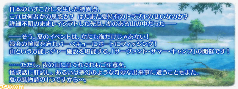期間限定イベント「復刻:サーヴァント・サマーキャンプ! ~カルデア・スリラーナイト~ ライト版」開催決定。発生した微小特異点解消のためレイシフトした先は、湖畔の緑豊かな山中。そこで遭遇する数々の“おかしな出来事”の原因を突き止めよう。