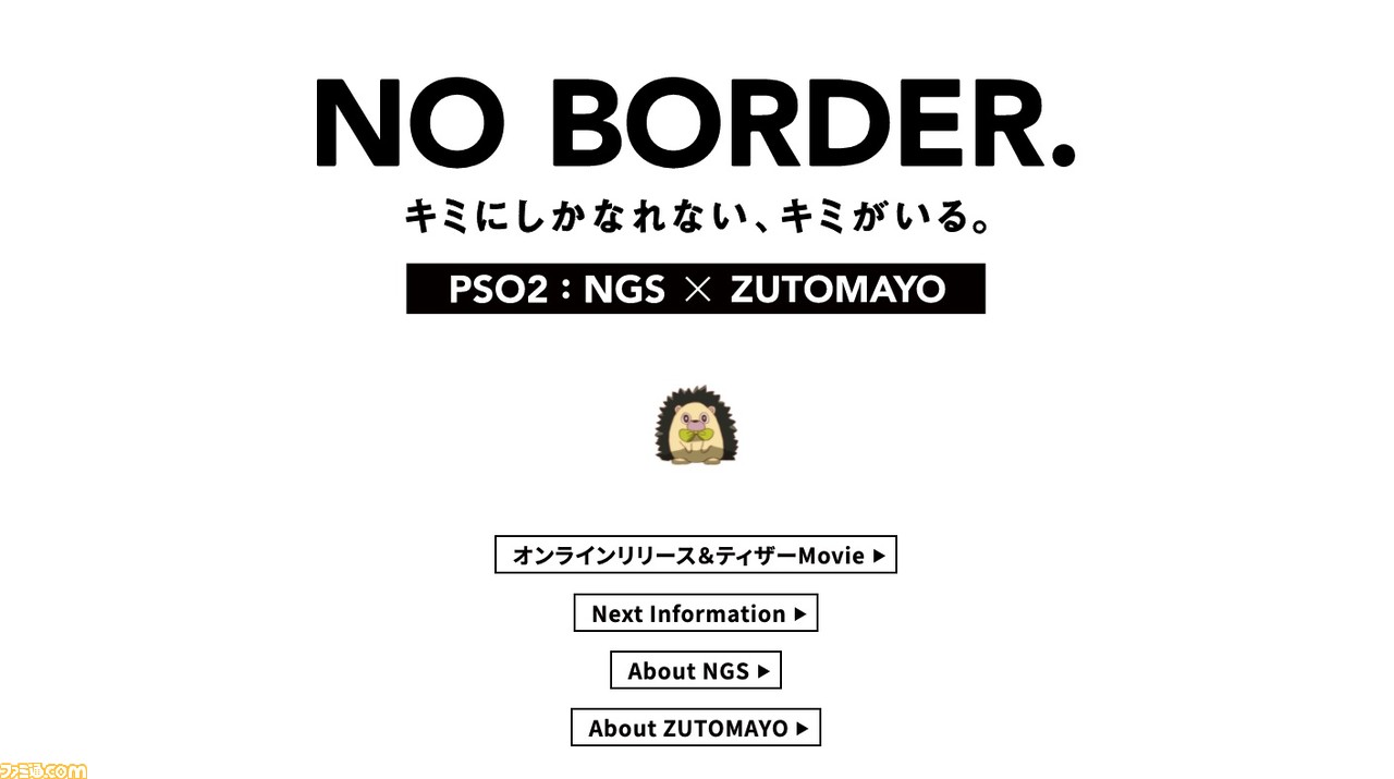『NGS』と『ずっと真夜中でいいのに。』とのコラボによる新プロジェクト「NO BORDER.」では、『NGS』の特徴の一つである“究極を超えるキャラクタークリエイト機能”を体現したメッセージ「NO BORDER. キミにしかなれない、キミがいる。」を、コラボ楽曲やスペシャルPV、アニメーションMV等の様々なコンテンツを通じて伝えていきます。今後の展開にもご期待ください。