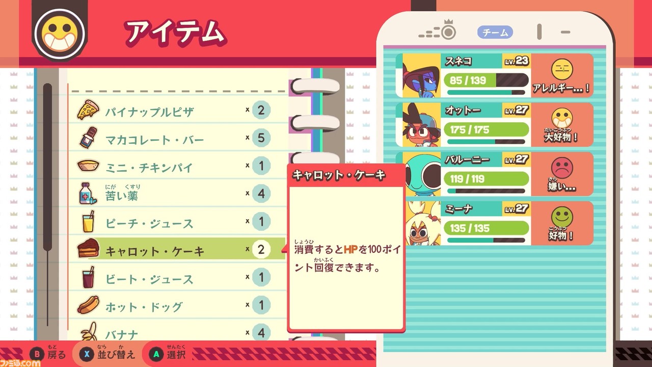 また非戦闘時に使える回復アイテムなんかもあり、使用するキャラの好き嫌いによって効果が変動するシステムが入っているのも面白いところ。