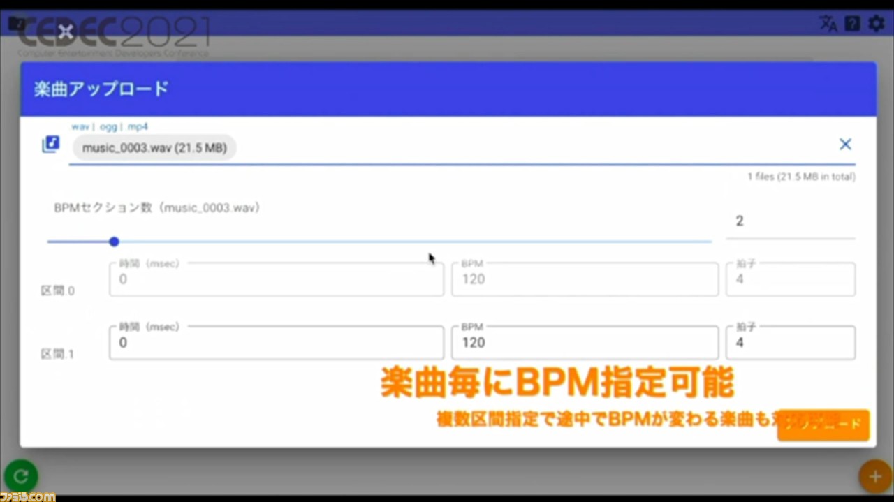 ここからは、ツールの使いかたについて解説。まずは、専用アカウントにログインし、楽曲をアップロード。このとき、楽曲のBPMの指定も可能。BPMを指定することで、譜面制作の精度が上がるとのこと。