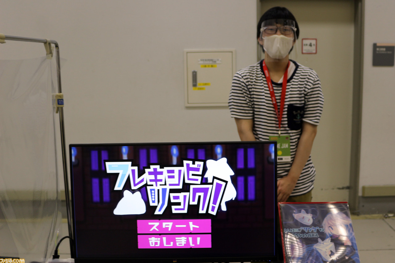 『フレキシビリンク!』を制作したTeam09のメンバーは、プランナー5人、プログラマーふたり、2Dデザイナーひとりの8人構成。ブースにいたプランナーのひとり・堀川竜聖氏によれば、制作期間は約1ヵ月間。ゲームジャム会場でメンバーと顔を合わせて制作したのは1~2日ほどで、ほぼオンライン上のやりとりによる制作だったとのことです。オンラインを介しての共同作業の感想を尋ねると、スケジュール管理や意思の疎通面に関しても、とくに問題なかったとのこと。堀川氏がゲームジャム初参加だったこともあり「ゲームジャムとはそういうもの」と認識している面もあるでしょうが、今後のゲームジャムはオンライン開催がスタンダードになっていくような気がしました。