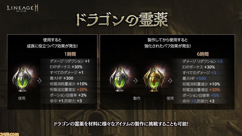 「ドラゴンの霊薬」は、使用することで「ダメージ リダクション」や「EXP ボーナス」を一定時間向上できるほか、製作の材料として使用できる新アイテムです。この「ドラゴンの霊薬」を含む特別なパッケージも、本日同時に登場します。