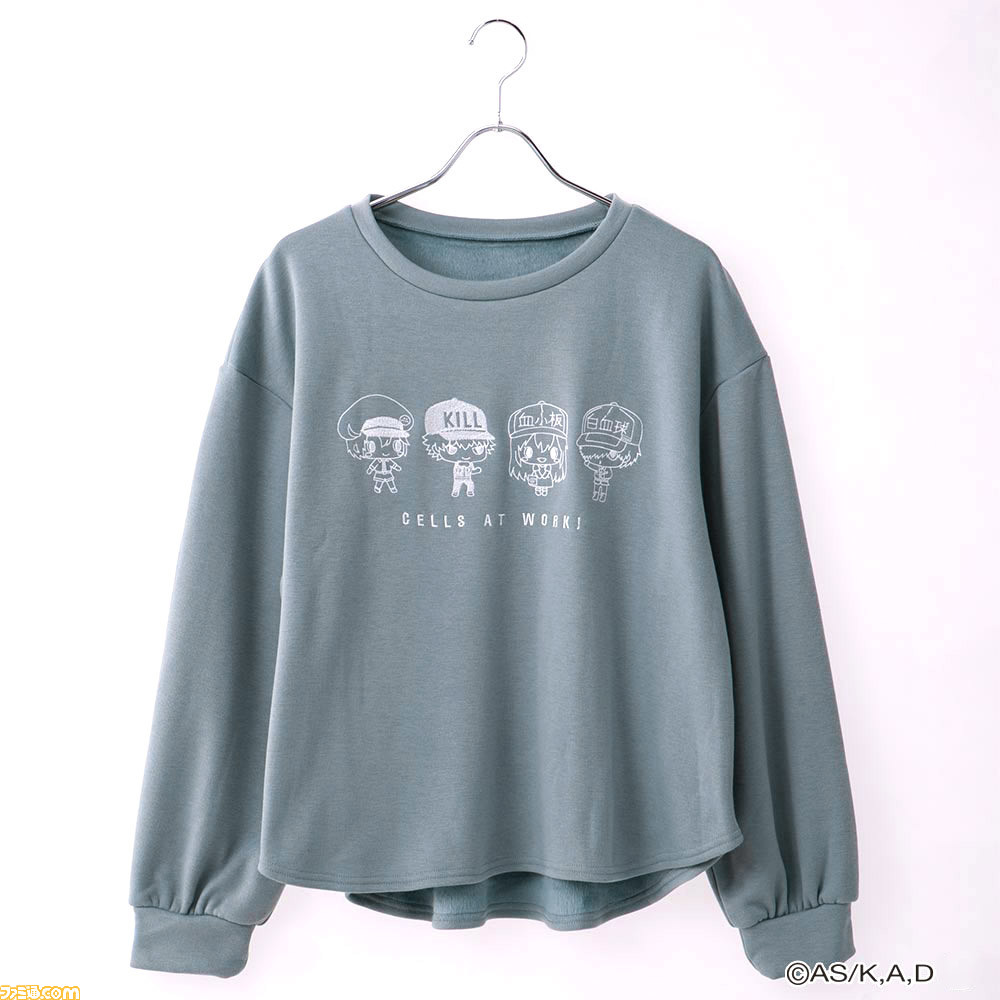 フロントには「Cells at work!」の文字、 バックには赤血球と白血球(好中球)、 キラーT細胞(メモリーT細胞)、 マクロファージ、 血小板、 ヘルパーT細胞が大集合したトレーナーです。