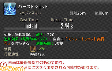 注目したいのは、歌やおもなアビリティのリキャスト、効果時間に調整が加えられている点。自身を強化するバフ系のアビリティが60秒、120秒周期になっており、ほかのパーティメンバーのバーストに合わせやすくなったという印象だ。