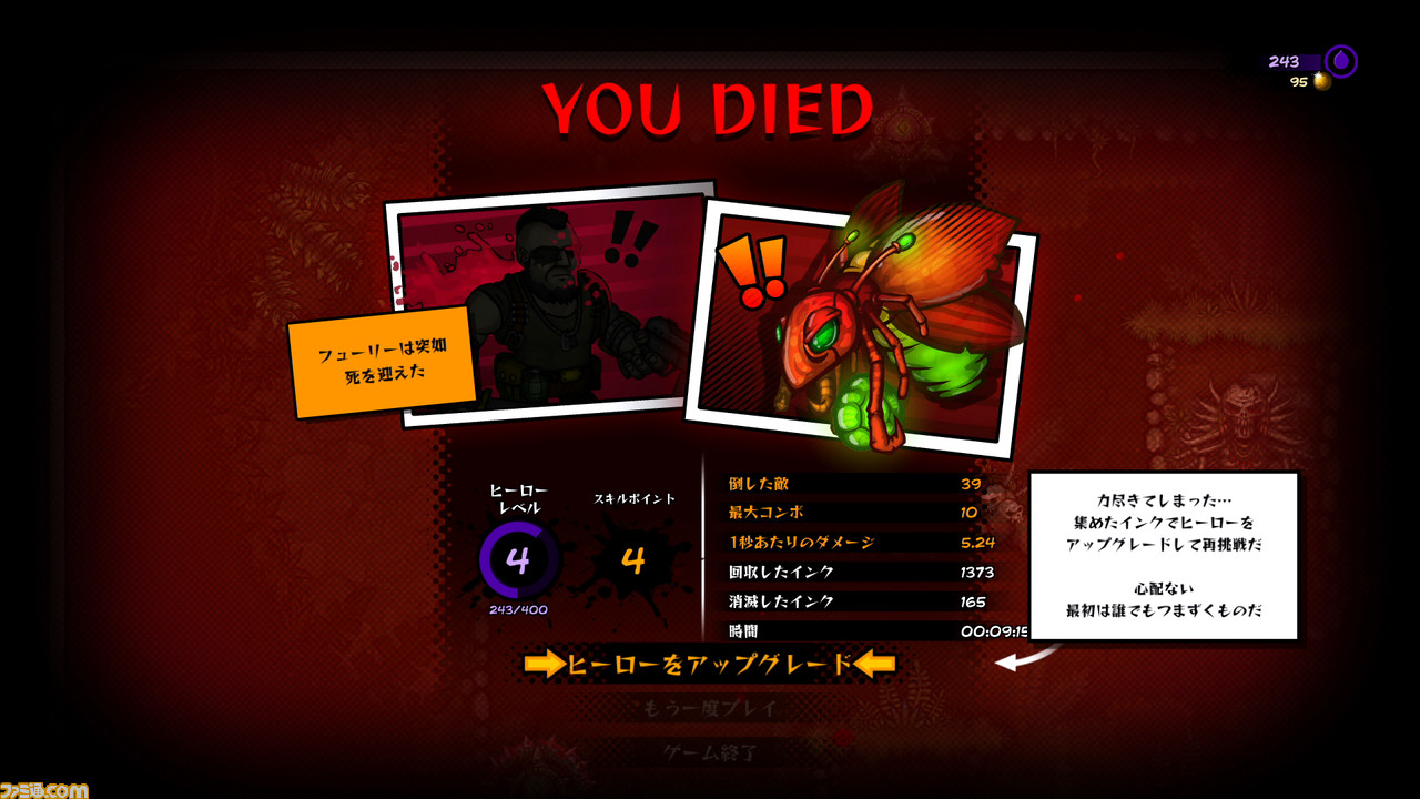 だが、ゲームオーバーになっても安心だ。集めたインクの量に応じて“ヒーローレベル”が上がり、“スキルポイント”を獲得できる。このポイントを使ってフューリーをアップグレードすれば、つぎ以降のプレイでより有利になっていくわけだ。