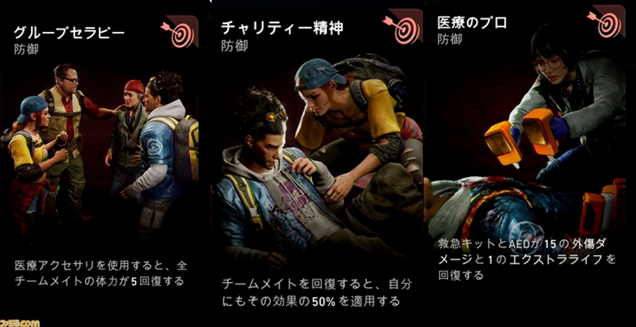 回復に特化した、ドクやマムに向いているカード群。ほかにもサポート系はあるが、この5枚はなるべく採用しておくのがオススメ。とくに【医療のプロ】は数少ない外傷ダメージ回復手段となっており、超強力。知らない人(いわゆる野良)とのプレイでは連携は難しいが、知人と遊ぶ場合は回復役に回復アイテムを渡してあげると回復効率がいい。