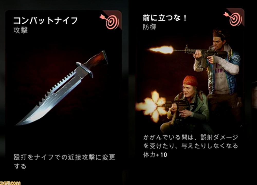 銃をメインに使う場合にオススメ。パンチ(殴打)が高威力のナイフ攻撃に変わるため、近接キルをしやすくなる。近接キルで体力が回復する【闘争心】と組み合わせれば、ちょっとした体力回復も可能になるのが強力だ。