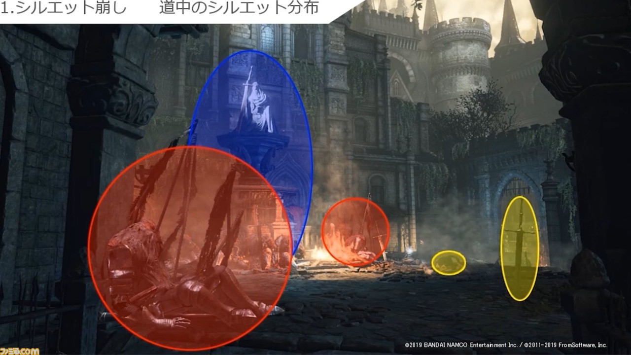 ここまではあくまで、セオリーとして大事にしていること。最後は、より印象的な絵作りができる、フロム・ソフトウェアらしいビジュアルについて。ステージ背景から、プレイヤーにより印象的な体験を味わってもらうため、さまざまな工夫を凝らしているという。
