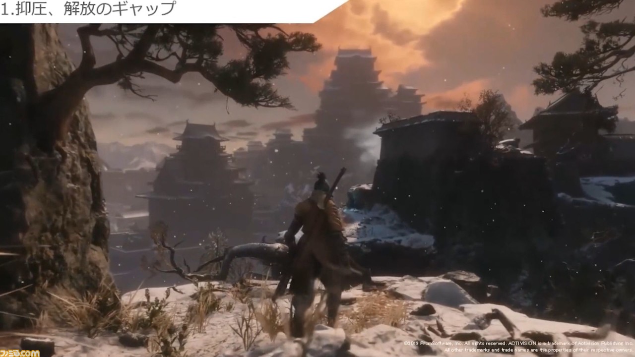 さらに、落下死について。「ここ降りられそうだな」と落ちてみたところ、落下死したりダメージを受けることも、ゲームではよくあること。『SEKIRO』ではそれを失くすために、“ここから落ちたら絶対に死ぬだろう”という、断崖絶壁にしているそうだ。ここについては、『ダークソウル』シリーズでは「いけそうだけど落ちたら死ぬ」みたいなスポットも少なくないので、『SEKIRO』だけの話のように感じた。
