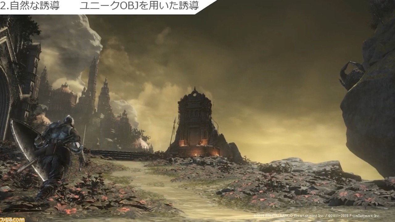 まずは“抑圧、解放のギャップ”について。狭い通路を抜けた先に、広大な背景が広がるシーンは、フロム・ソフトウェアタイトルではたびたび見受けられるシーンだ。これらは意図的に用意しているそうで、視界が開けることで、ギャップの効果により見せたいモノがダイレクトに伝わるほか、背景のクオリティの高さも同時に味わえるというわけだ。