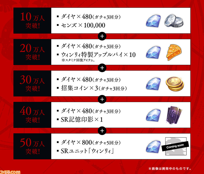 『鋼の錬金術師 MOBILE』公式サイトにて、事前登録受付中です。事前登録者数に応じて、豪華報酬がボリュームアップ。事前登録者数が50万人を突破すると、合計でガチャ20回分のアイテムやSRユニット「ウィンリィ」などをゲーム配信時にプレゼントいたします。