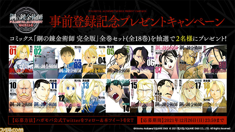 さらに、『鋼の錬金術師 MOBILE』公式Twitterアカウントにて、抽選で2名にコミックス“鋼の錬金術師 完全版”全巻セット(全18巻)が当たる事前登録記念プレゼントキャンペーンも開催された。