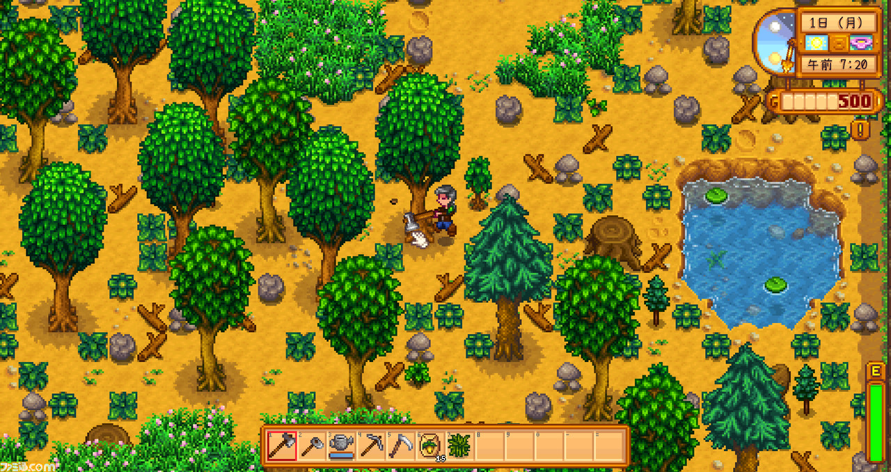 種類にもよりますが、作物が育つには数日から数週間かかります。それに、道具の耐久度は減りませんが、画面右下に表示されているプレイヤーの体力(エナジー)ゲージは、何らかの作業をするとぐんぐん減っていきます。