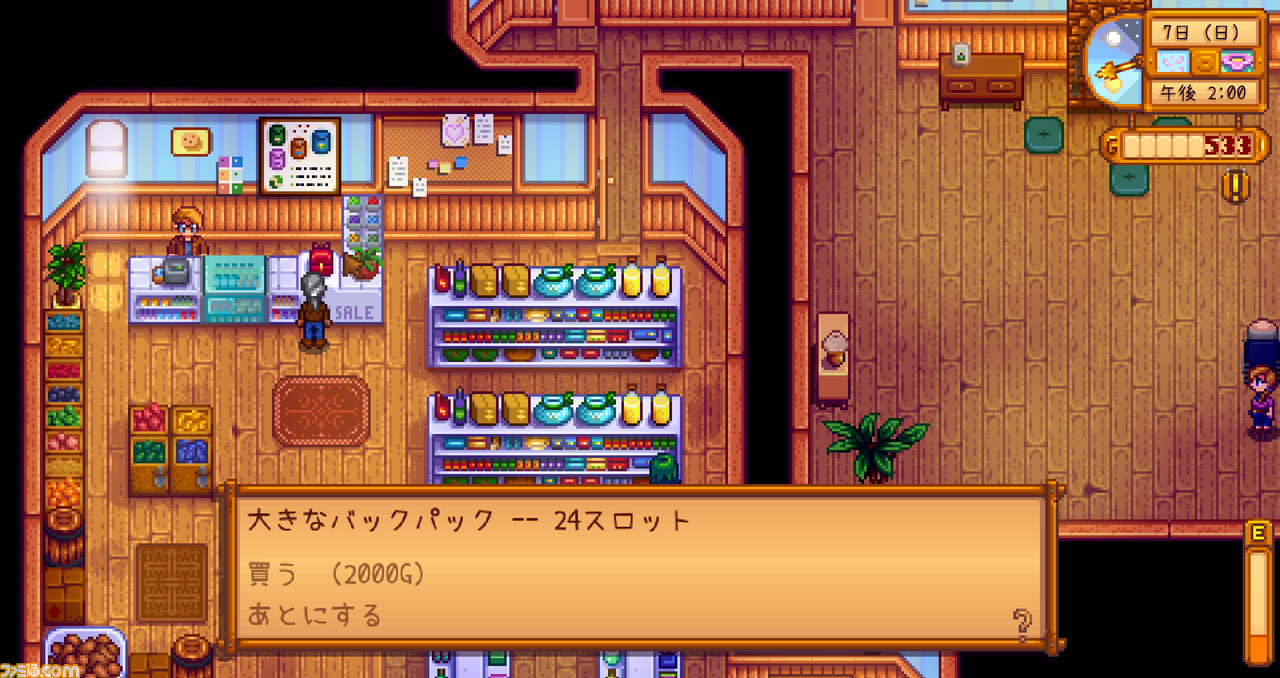 序盤はエナジーの回復アイテムは貴重なので、家で寝て回復しましょう。そうして日数が過ぎたら作物を収穫して売れば、お金が得られるわけです。