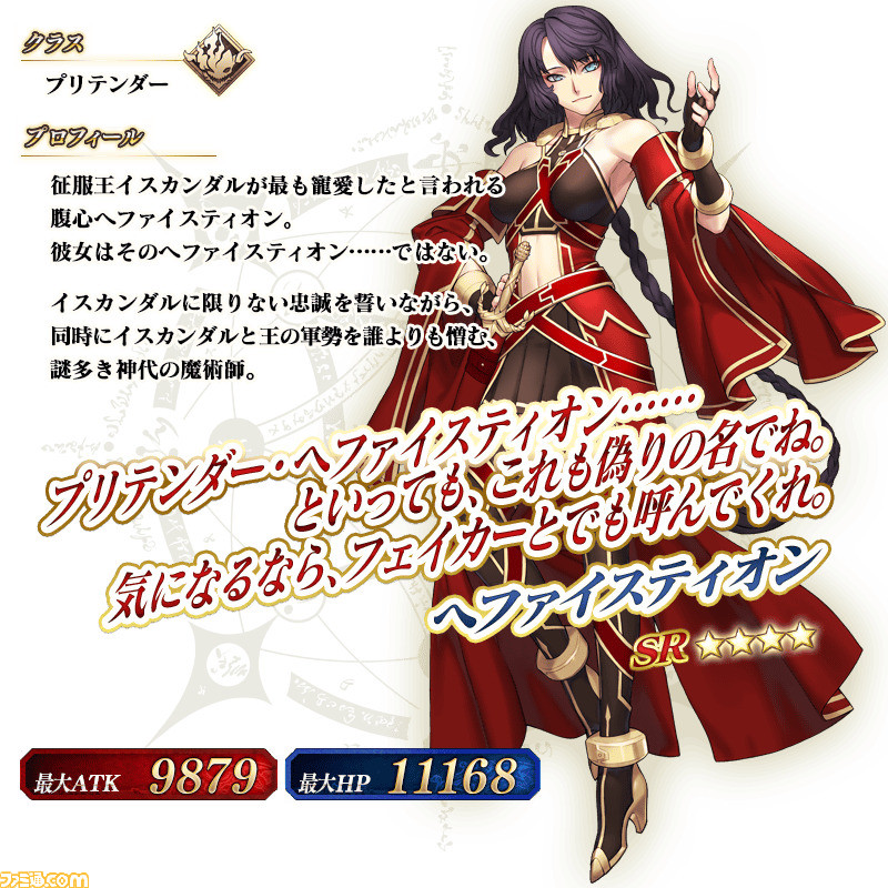 ヘファイスティオンは、“復刻 レディ・ライネスの事件簿 -Plus Episode-ピックアップ召喚”にて初実装された星4プリテンダー。