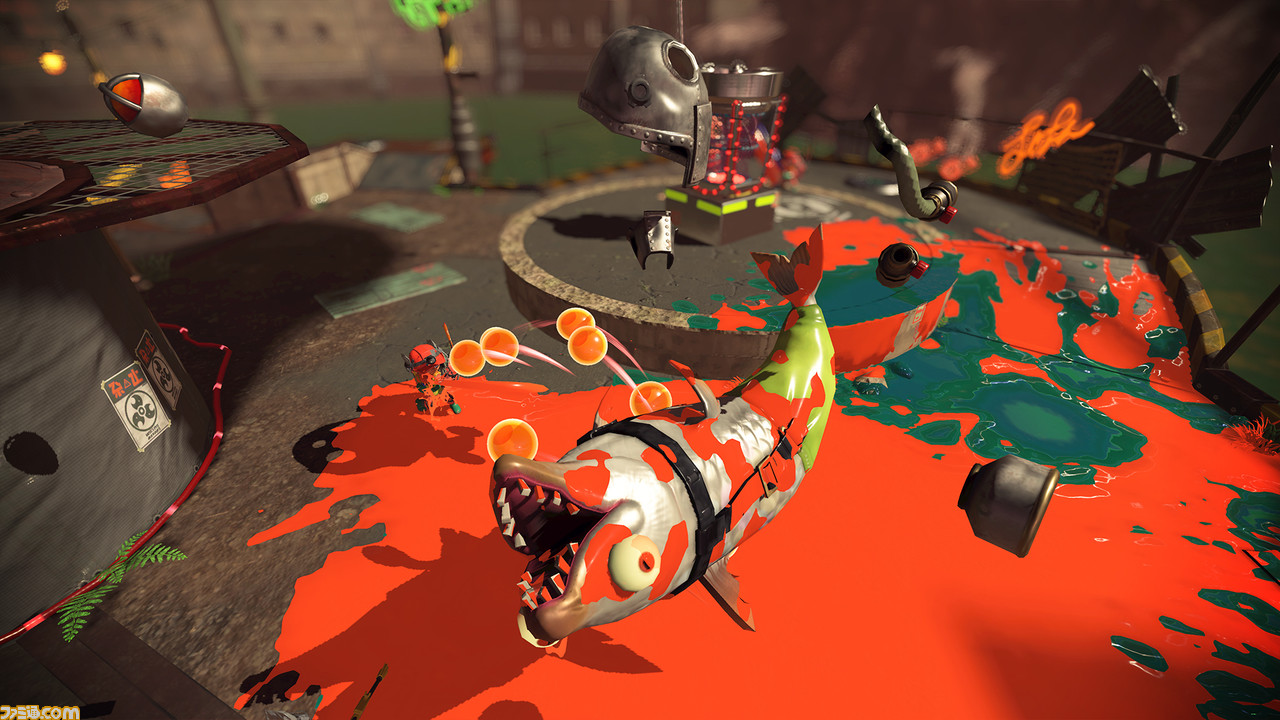 新たなバイトの現場として登場するステージは“アラマキ砦”。『スプラトゥーン3』の舞台となるバンカラ地方のシャケたちの前線基地だという。らせん状に渦を巻いた高台を目掛け、あらゆる方向からシャケたちが迫り来る!