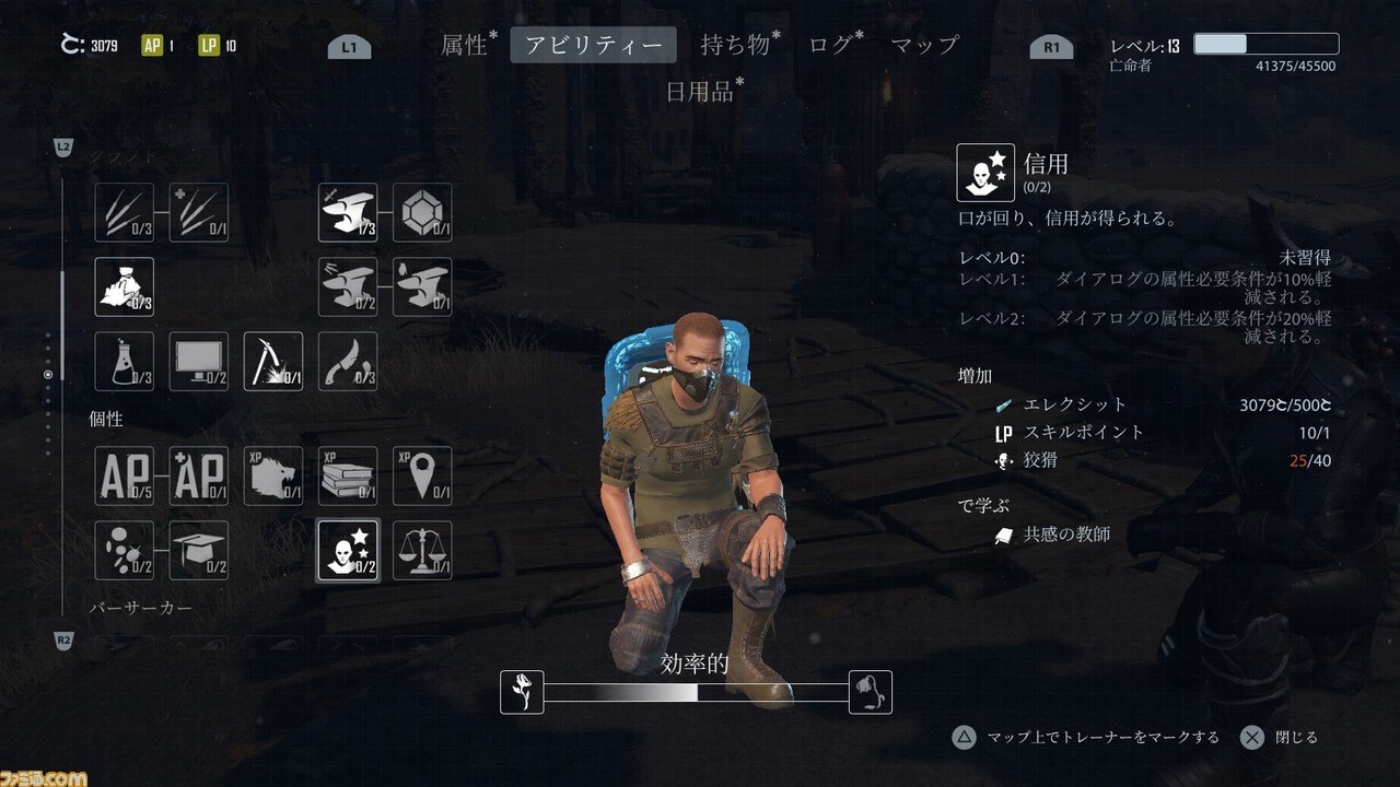 アビリティを習得するには、そのアビリティを教えてくれる“トレーナー”に教えを乞う必要があります。トレーナーごとに教えてもらえるアビリティの種類は異なっているので、世界各地から、対象となる人物を見つけましょう。教えを乞うために能力以外に必要となってくるのが、この世界で通貨の役割を果たしている“エレクシット”です。