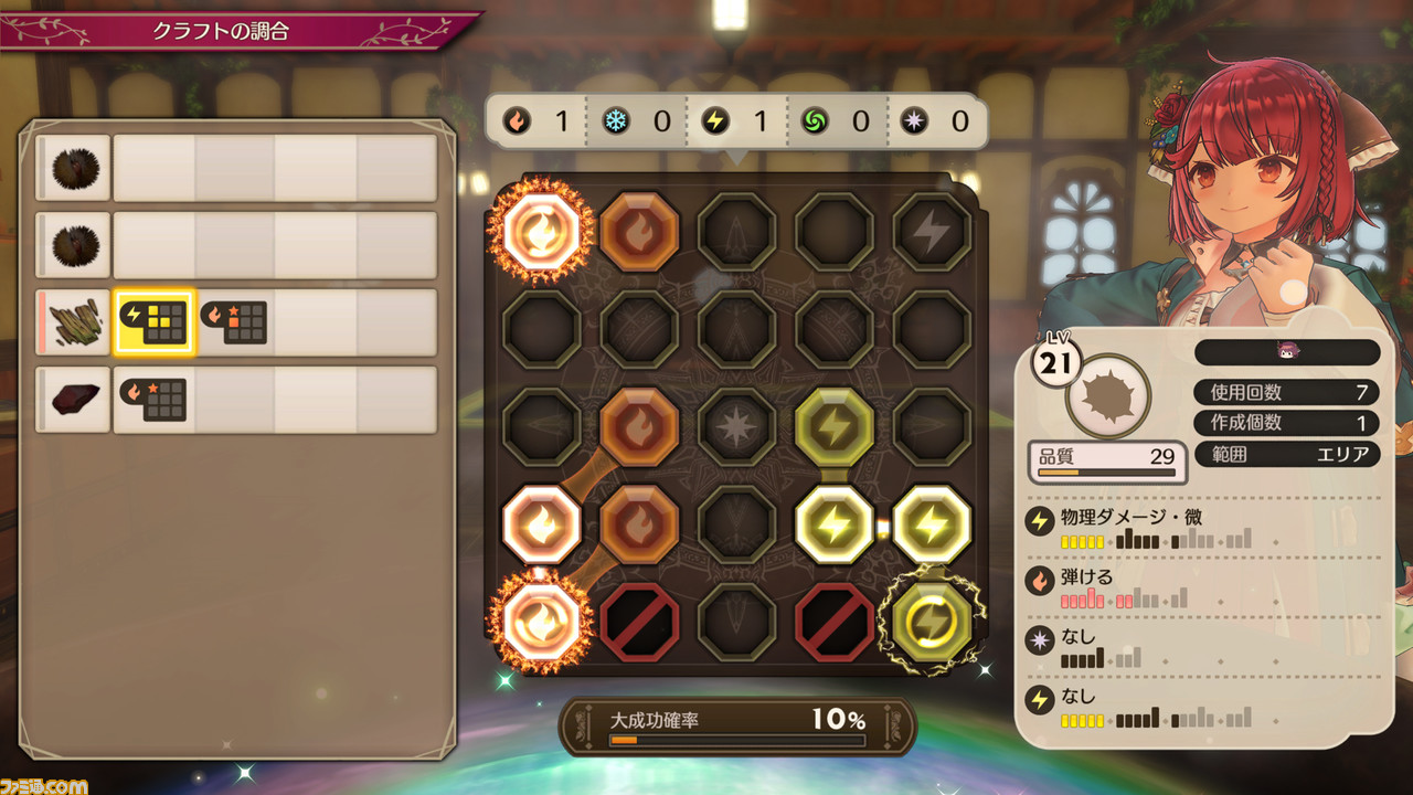 本作には2種類のパネルがあり、通常パネルと、調合難易度が高いリバースパネルを選んで調合できます。リバースパネルは盤面がやや複雑にはなるものの、うまく材料を配置することができれば、通常パネルでは得られないような高い効果をもったアイテムを調合できます。