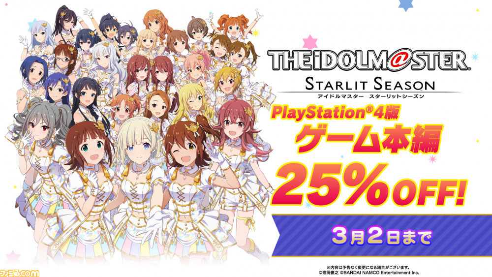 このキャンペーンでは家庭用アイドルマスターシリーズのダウンロード版をお求めになりやすい価格でご購入いただくことができます。家庭用最新作「アイドルマスター スターリットシーズン」のPlayStation4版がセール価格にてお買い求めいただけます!