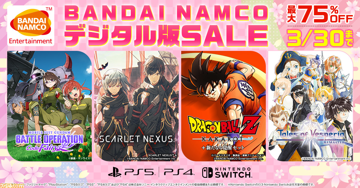 また、ニンテンドーeショップでは“バンダイナムコエンターテインメント Nintendo Switch春休みセール”を開催。『ドラゴンボール Z KAKAROT + 新たなる覚醒セット』や『テイルズ オブ ヴェスペリア REMASTER』など定番タイトルがお得に購入できる。