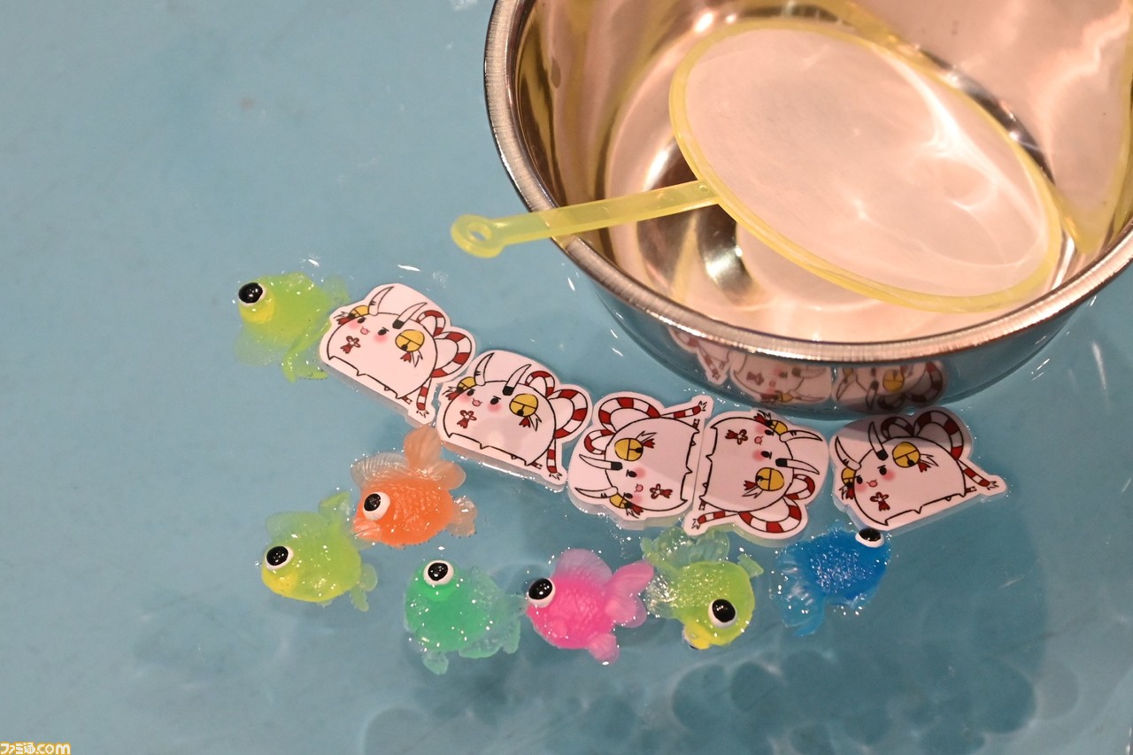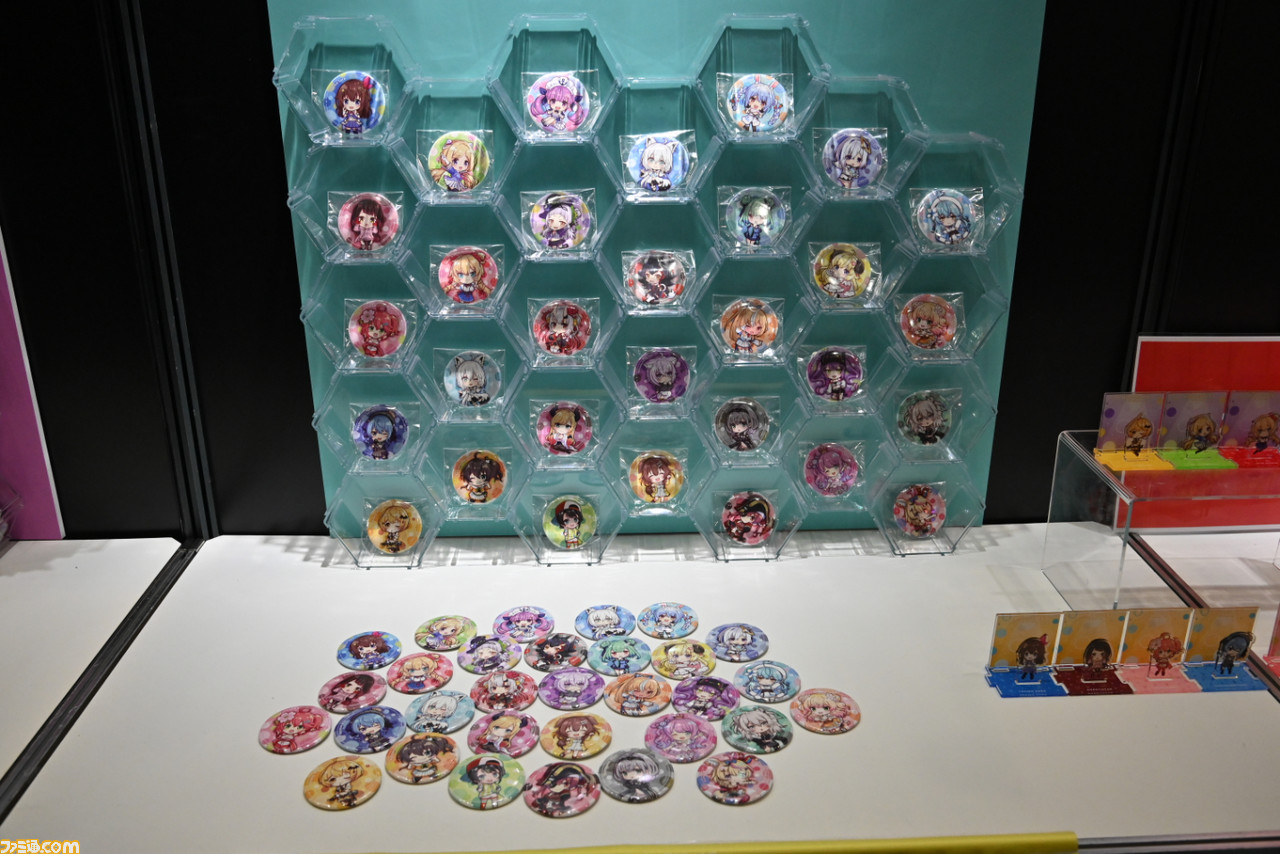 モチっとした人気ぬいぐるみ“もちころりん”や、ぺたんと座ったポーズがキュートな“ぺたん娘ラバーストラップ”のホロライブバージョンの新商品などが展示。今回物販ブースでも販売されていたシールや缶&ステッカーなども展示されていて、これは欲しくなる! ちなみに筆者は2期生をすべて予約済み。