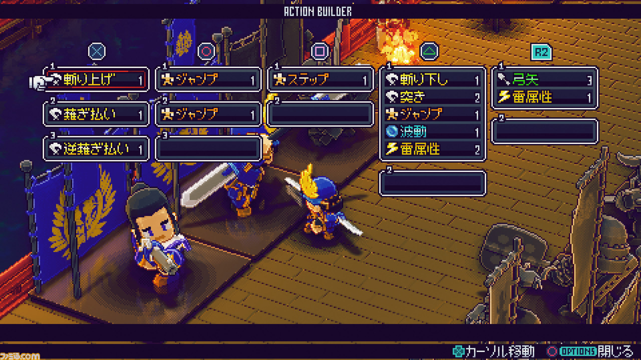 この各ボタンに割り振るアクションは、侍衆や妖怪を倒すとランダムでドロップする“戦技の巻物”を取ることで増えていく。同じアクションを重複して登録することで、そのアクションがより大振りで強力なものになる。