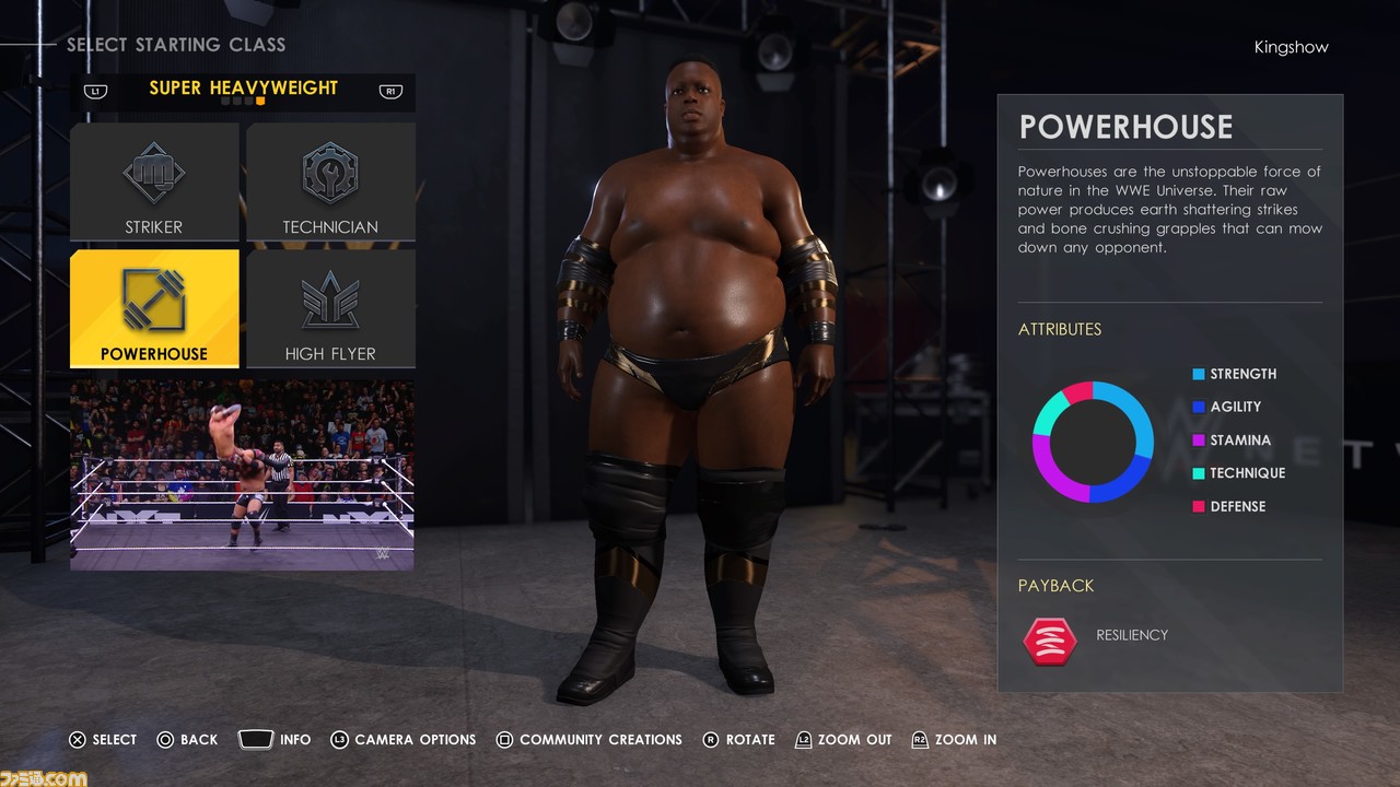 作成した選手はオンラインコミュニティーにアップロードでき、ほかのプレイヤーが作った選手をダウンロードして遊んだり、カスタマイズしたりすることもできます。コミュニティーには制作期間の関係で本作に収録されていない選手や他団体の選手、プロレスに関係ない有名人からオリジナルキャラクターにいたるまで、かなりカオスな顔ぶれが並んでおり、世界中のプレイヤーが作った選手たちを眺めるだけでも楽しめます。