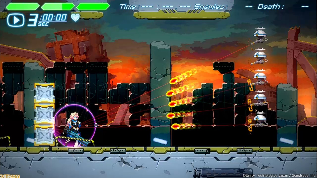 しかし、いわゆる死に覚えゲーではなく、ライフの代わりとして“時間逆行(ウロボロスシステム)”というものが存在している。時間逆行は、即死した瞬間から最大3秒前まで時間を巻き戻せるというもので、本作のおもしろさを格段に上げてくれている要素のひとつ。