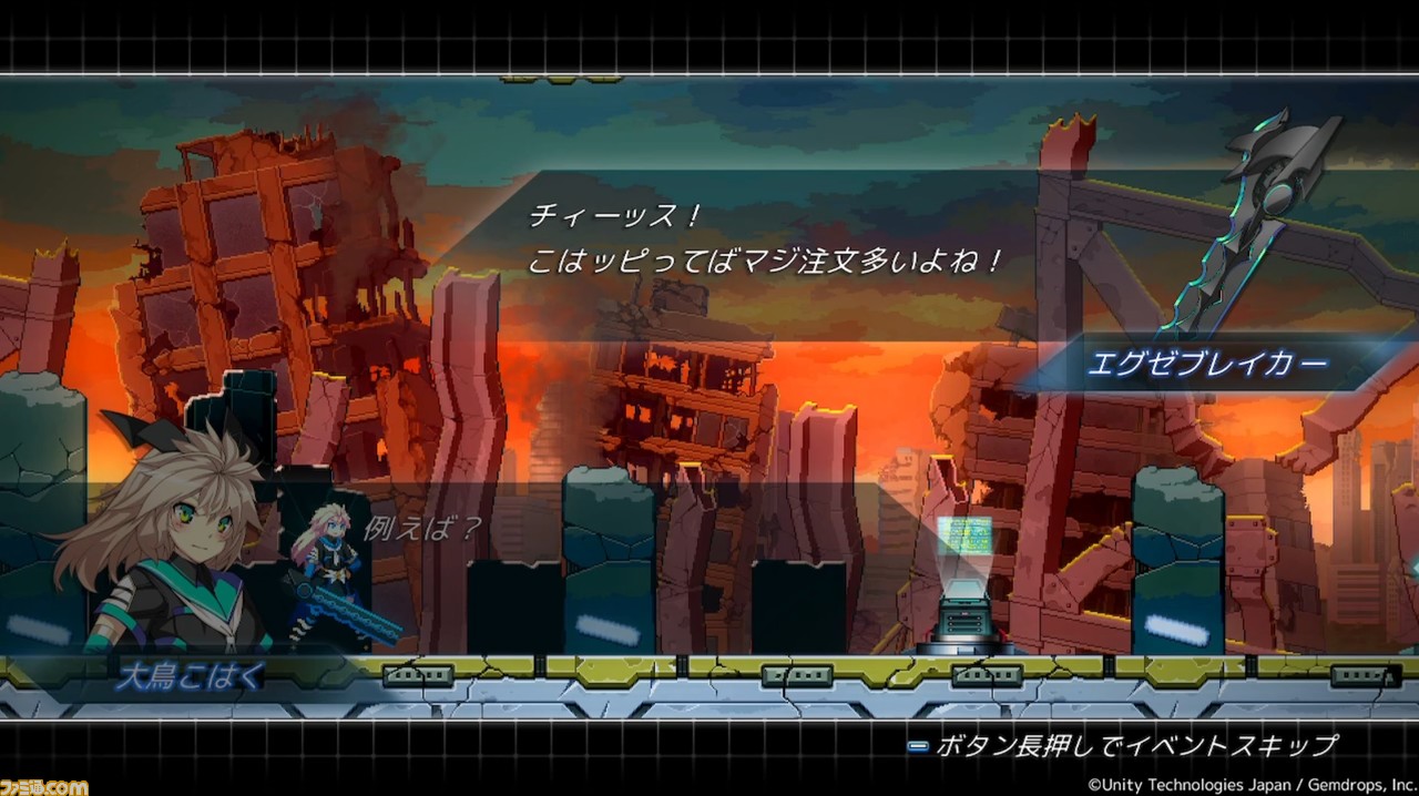 『COGEN: 大鳥こはくと刻の剣』は、多彩なギミックや敵が待ち受けるステージを攻略していく横スクロールアクションだ。プレイヤーは主人公である大鳥こはくを操作し、エグゼブレイカーという剣を振るって敵をなぎ倒していく。