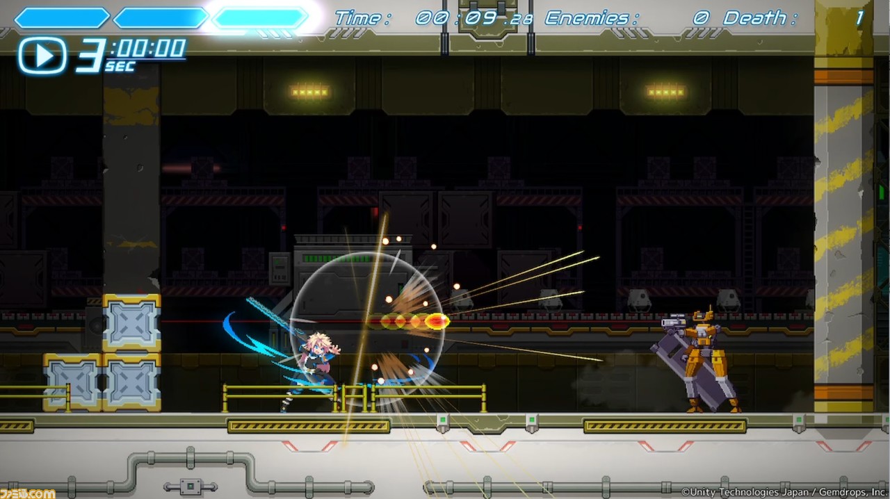 画面左上には3本のゲージがあり、1本あたり1秒まで時間を巻き戻せる。これを利用して防げなかった弾を弾いたり、回避行動をやり直せるというわけだ。また、ダメージを受けなくても任意のタイミングで時間を巻き戻せるため、失敗したと思ったらすぐにやり直すのもアリ。