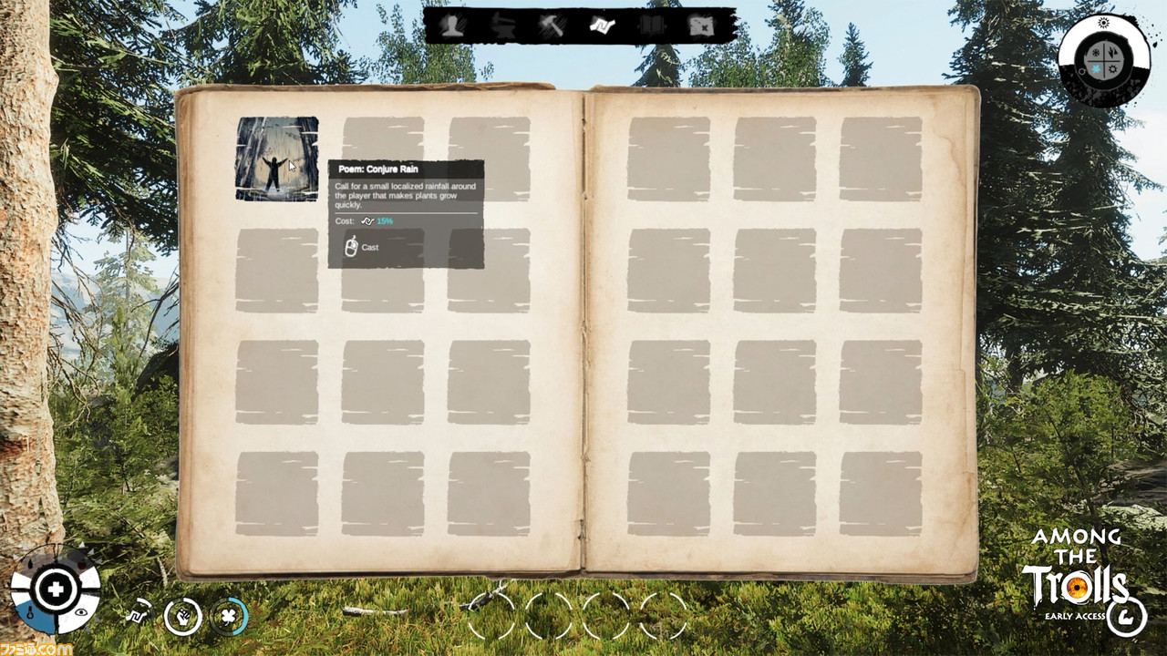 特徴的なのが、現実世界とは趣が違う点。伝承や民間信仰、精霊といったものが存在する世界となっており、精霊から助言をもらったり、要求されたアイテムを渡したりすることが必要になってくる。また、たとえば森の中に潤沢にある資源をむやみに取るとあっという間に辺りが暗闇に包まれ、恐ろしい生き物に襲われてしまうなど、現実世界とはひと味違う“生きる術”を見出すことが、生き延びるただひとつの手段となるのだ。